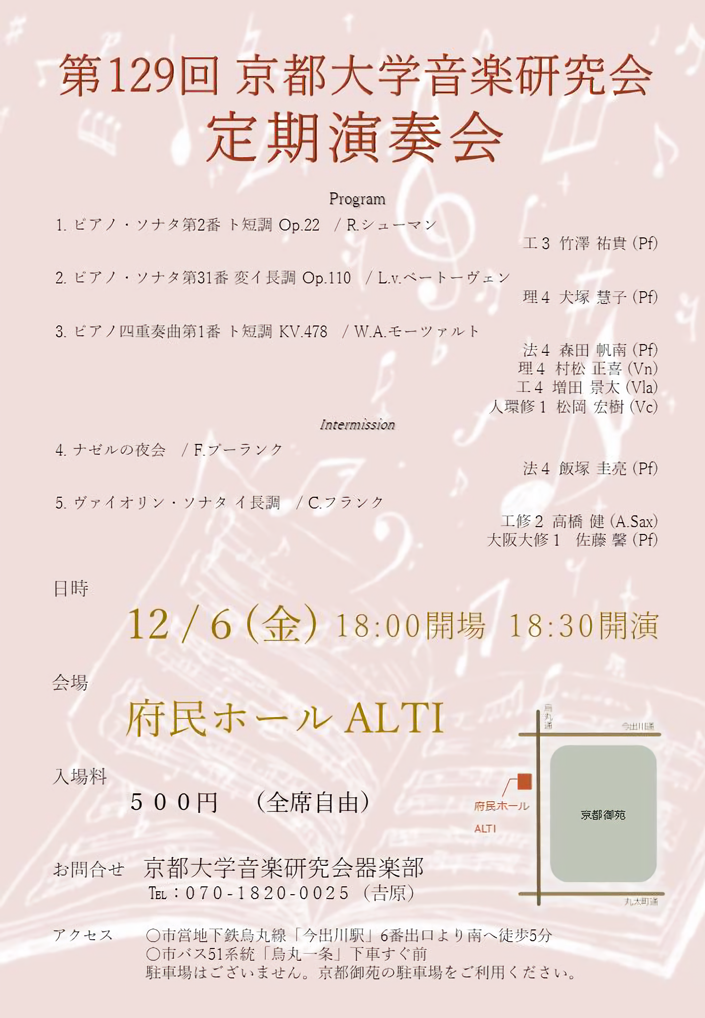 日に日に寒さが増し、木々が赤や黄色に色付いて参りました。第129回 京都大学音楽研究会 定期演奏会の開催をお知らせします。